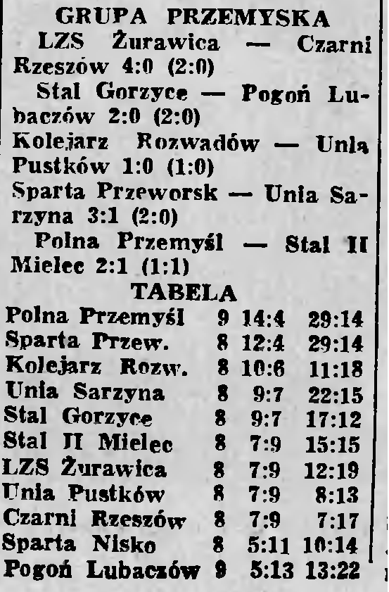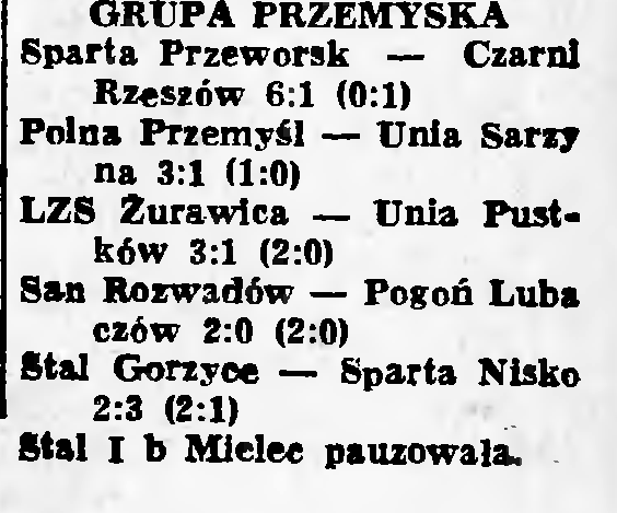 Wyniki zostały podane w poszczególnych wydaniach „NOWIN”, lecz bez odpowiednich tabel, na podstawie których można było ustalić wyniki niektórych meczy. W Żurawicy byłem na meczu Żurawianki z Czarnymi Rzeszów, Orkanem Nisko i Unią Pustków.