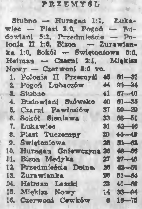 | 8. | Piast Tuczempy | 30 | 29 | 44-49 |